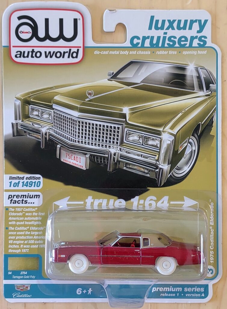 This is a 1975 Cadillac Eldorado featuring metallic ultra red paint and white tires and wheels. This highly detailed diecast model from Auto World features a metal base and body with realistic rubber tires on premium wheels. This is the Ultra Red Chase Version of this vehicle which is only 3% of the entire production run.