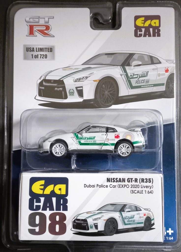This is a Era Car 1:64 Nissan GT-R R35 Dubai Police Car EXPO 2020 Livery. It’s white and green with white chrome wheels.