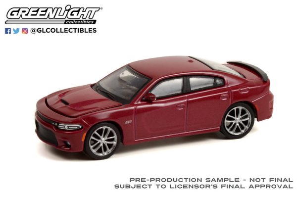 This is a 2017 Dodge Charger R/T Scat Pack featuring crimson red paint, chrome 5-spoke wheels, and a black deck spoiler.