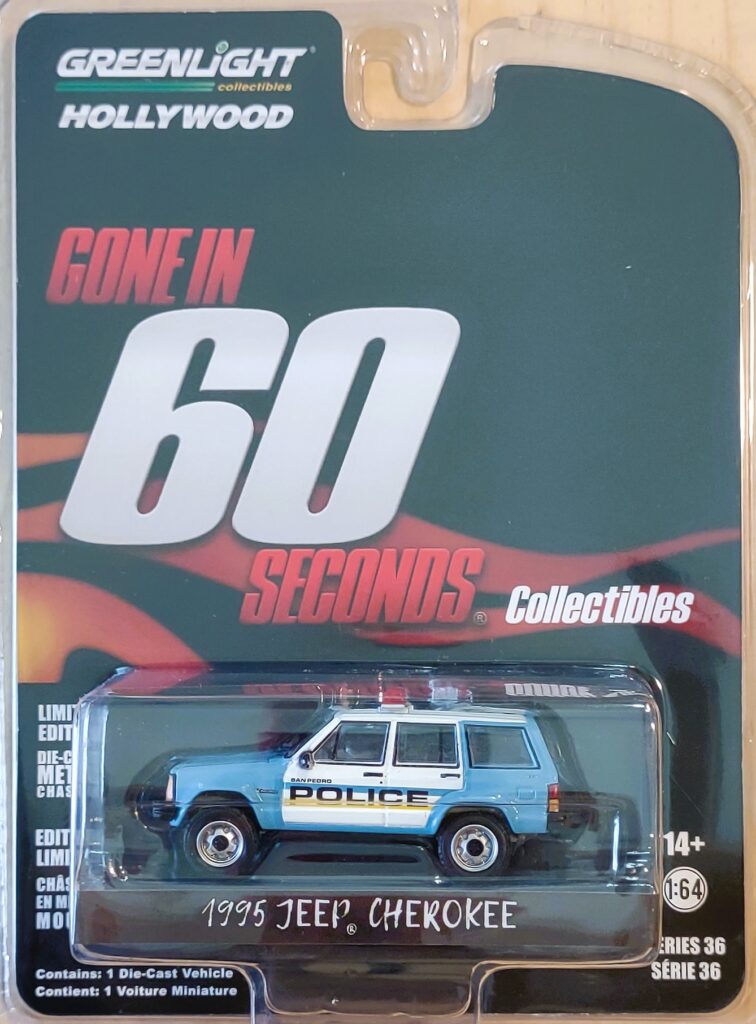 This is a 1995 Jeep Cherokee police car from Gone in 60 Seconds. It is light blue and white with silver wheels and rubber tires.