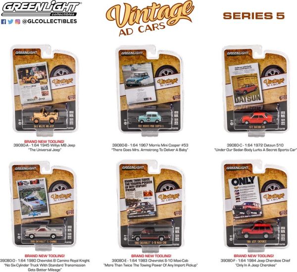 This is a sealed case of Greenlight Vintage Ad Cars Series 5. This case features a 1945 Willys MB Jeep, 1967 Morris Mini Cooper S, 1972 Datusn 510, 1980 Chevrolet El Camino, 1983 Chevrolet S-10 Maxi Cab, and a 1984 Jeep Cherokee. All vehicles feature vintage car ads on the card art. A factory-sealed case has a chance to contain a rare Green Machine Chase vehicle.
