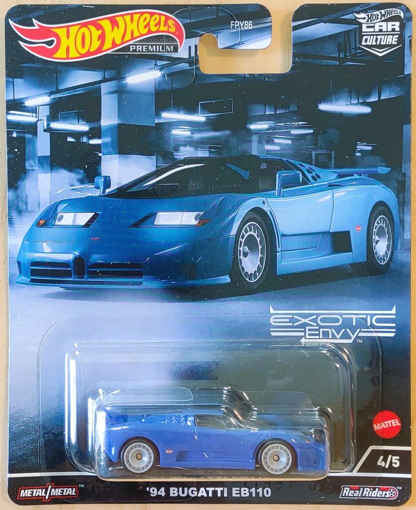 This is a ’94 Bugatti EB110 from the 2022 Hot Wheels Car Culture Exotic Envy Series. It features blue paint and grey Real Rider wheels.