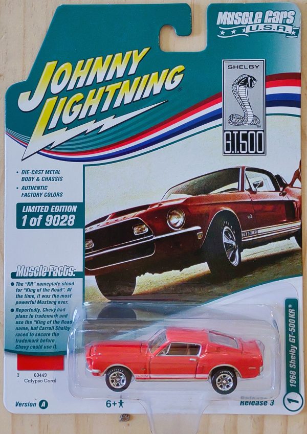 This 1968 Shelby GT-500KR from Johnny Lightning features Calypso Coral paint and chrome wheels. Limited to 9028 pieces.