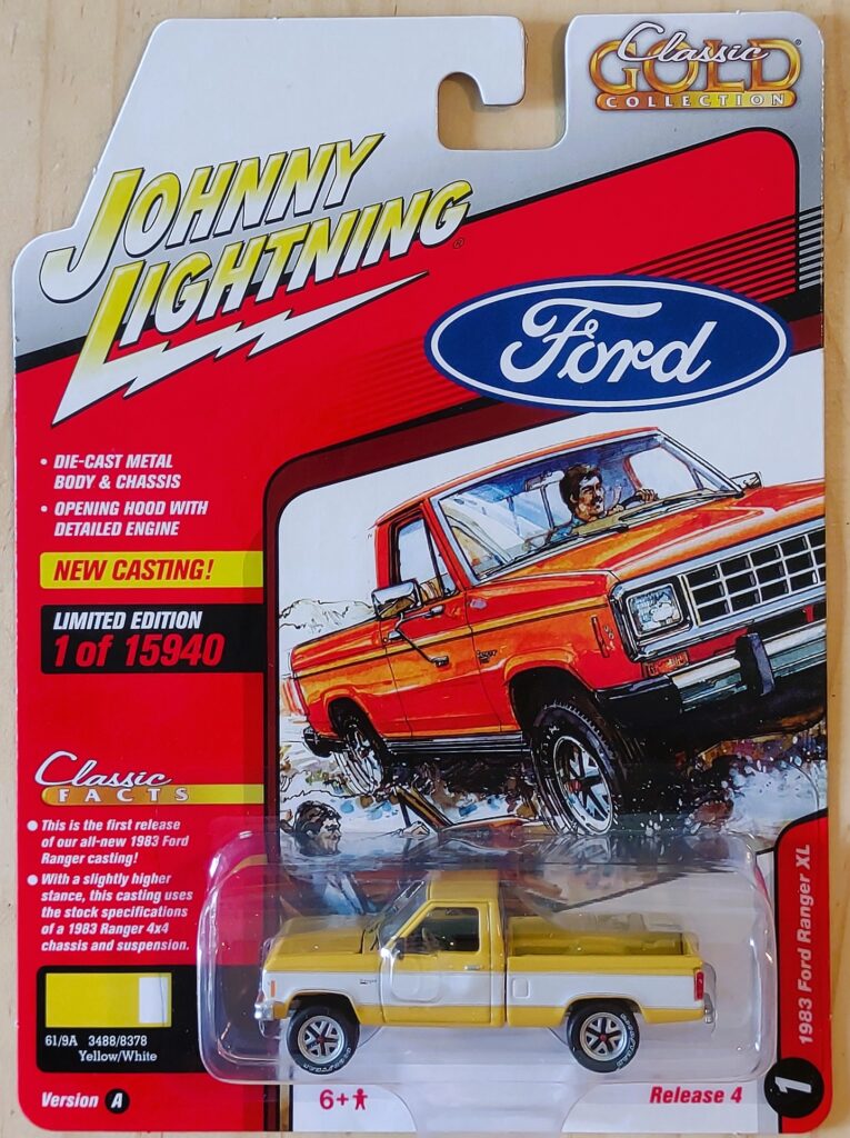 This is a 1983 Ford Ranger XL featuring yellow paint with a white stripe, chrome wheels and bumpers, and a beige interior. This is a high quality casting with factory matching paint and an opening hood.