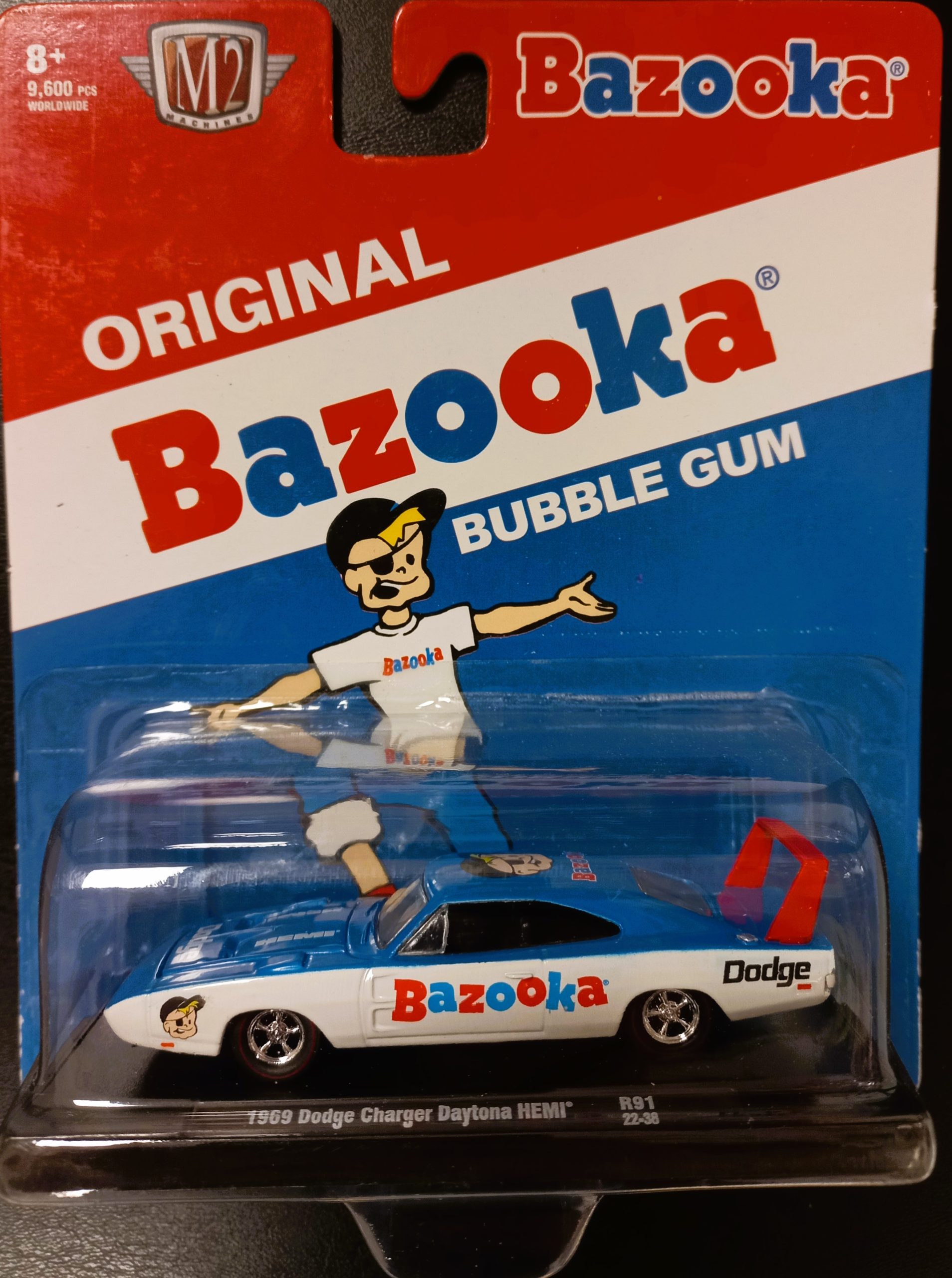 This is a M2 Machines Auto-Drivers R91 Bazooka 1969 Dodge Charger Daytona HEMI. It’s blue and white with chrome wheels and features bazooka graphics.