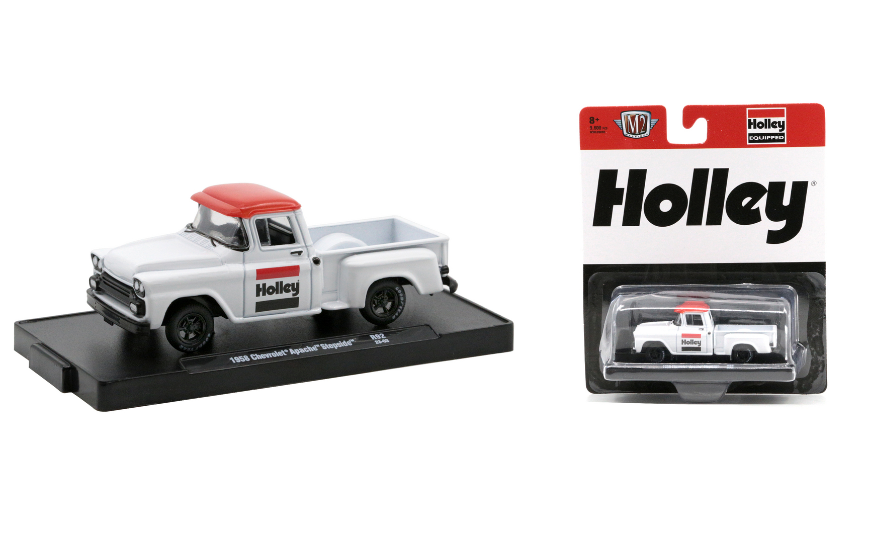 This is a 1958 Chevrolet Apache Stepside M2 Machines Auto-Drivers R92 Holley. Its is white with black wheels. It features Holley graphics.