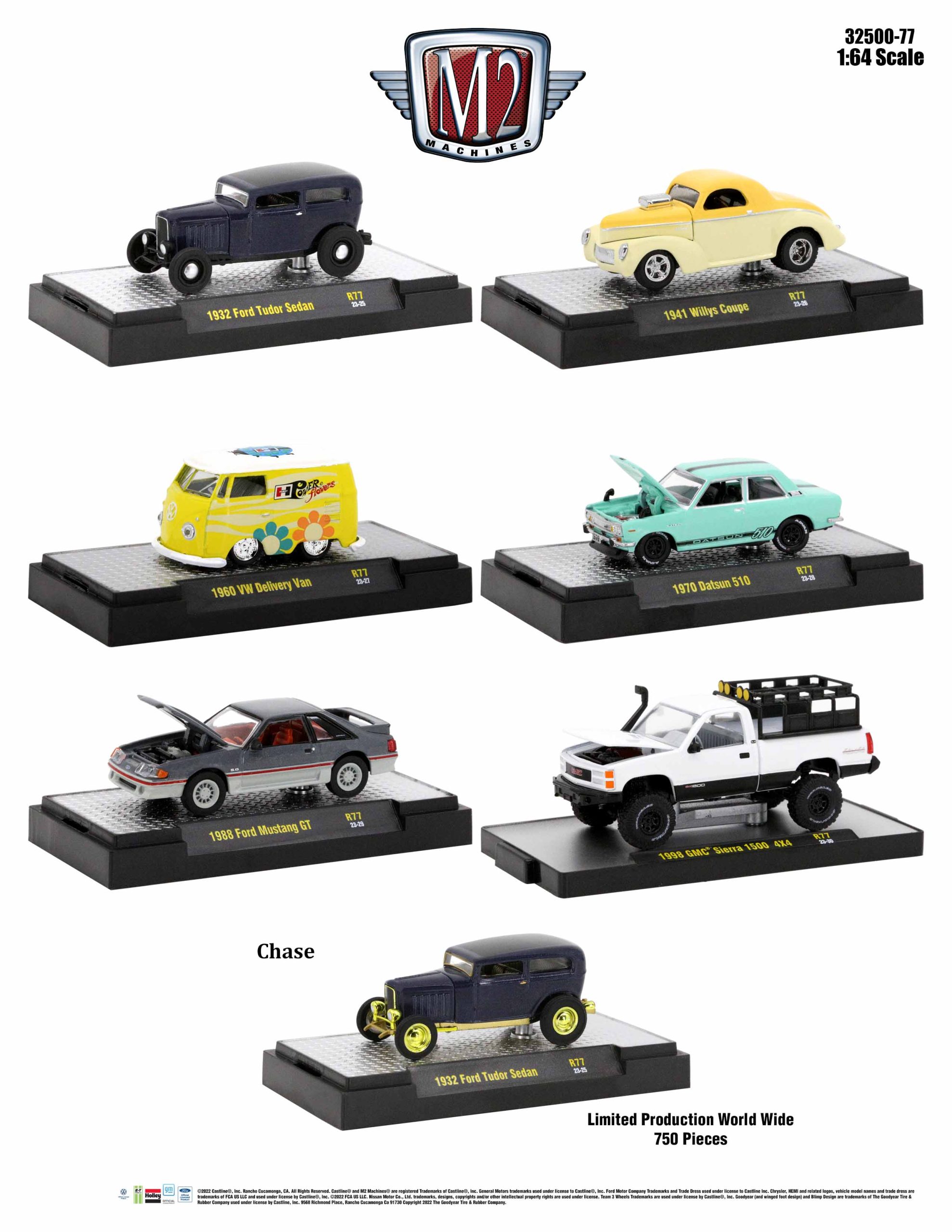 This is a sealed case of M2 Machines Auto-Thentics Release 77. This box includes a 1932 Ford Tudor Sedan, 1941 Willys Coupe, 1960 Volkswagen Delivery Van, 1970 Datsun 510, 1998 GMC Sierra 1500, and a 1988 Ford Mustang. With a factory sealed case, you also have a chance at finding a chase version of the 1932 Ford Tudor Sedan. This is a pre-order expected to arrive in June 2023.