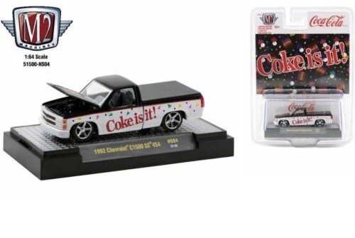 This is a M2 Machines Coca-Cola HS04 1992 Chevrolet C1500 SS 454. It’s black and white with chrome rubber wheels. On the side it says “Coke is it”.