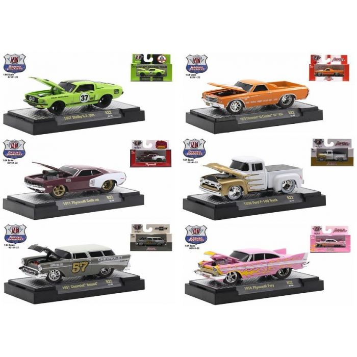 This M2 Machines Ground Pounders Release 22 factory sealed case features a 1971 Plymouth Cuda 440, 1956 Ford F-100 Truck, 1957 Chevrolet Nomad,1967 Shelby G.T. 500, 1970 Chevrolet El Camino SS 454, and 1958 Plymouth Fury