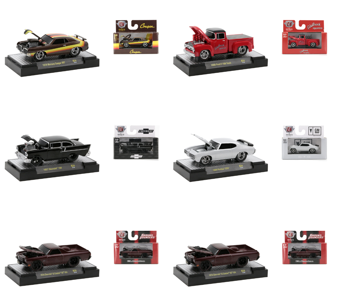 This is a M2 Machines Ground Pounders R24 Sealed Case of 6. This case includes 1970 Mercury Cougar XR7, 1956 Ford F-100 Truck, 1957 Chevrolet 150, 1969 Pontiac GTO, 1970 Chevrolet El Camino SS 454, and 1970 Dodge Challenger R/T 383. Buying a factory sealed case gives you a chance at a chase or a super chase.