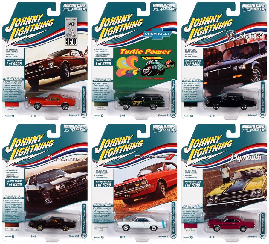This is a factory-sealed case of Johnny Lightning 2021 Muscle Cars USA Release 3A. It has a 1970 Dodge Dart Swinger 340, 1977 Pontiac Firebird T/A, 1970 Plymouth GTX, 1965 Chevy Chevelle Wagon, 1968 Shelby GT-500KR, and 1986 Buick Regal Grand National. You get a chance at a hard to find White Lightning Chase with a factory sealed case.
