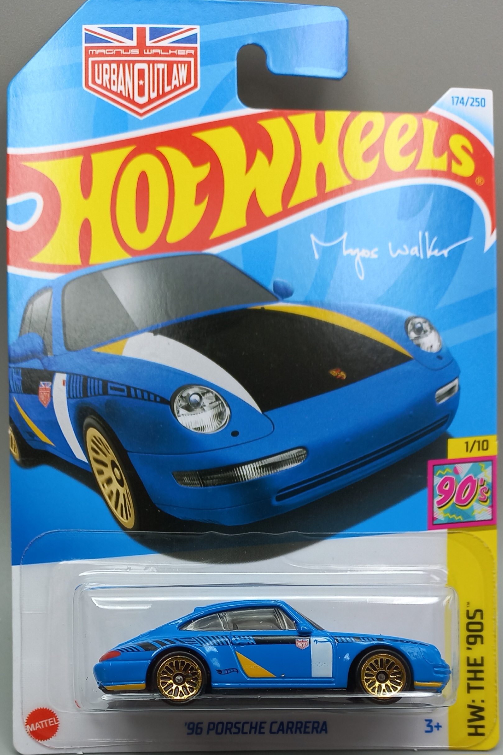 The first car we will be taking a look at is the ’96 Porsche Carrera. This Porsche features blue paint and gold rims The car also features Porsche branding on the front and Carrera on the rear. The car has been given a few decals along the side and is also adorned with the Magnus Walker Urban Outlaw logo. Overall, a great Porsche and another great addition to the Magnus Walker Hot Wheel contribution.