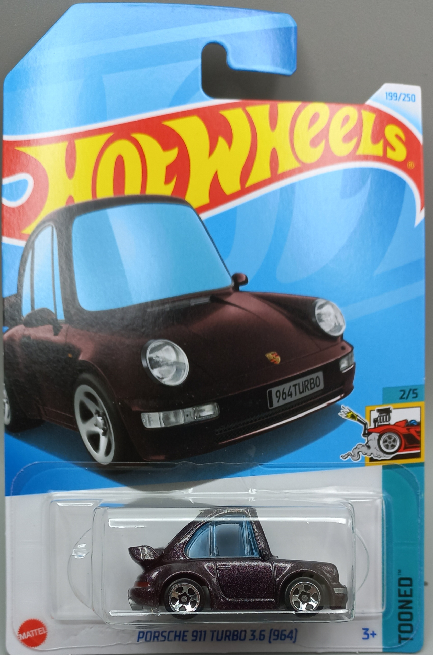 The next car we will see is the Tooned Porsche 911 Turbo 3.6 (964). While this car is a recolor, Mattel did a great job with this casting. The car maintains the Porsche emblem and Turbo badging from the previous model but the new paint is incredible. The dark purple-brown color stands out from most every other Hot Wheels car. This will be another car that could take effort to find in the wild.