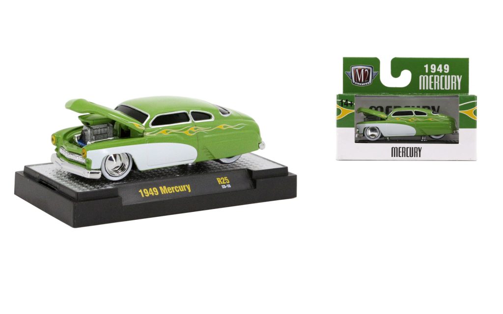 This is a 1949 Mercury from M2 Machines Ground Pounders R25. It is green with chrome wheels